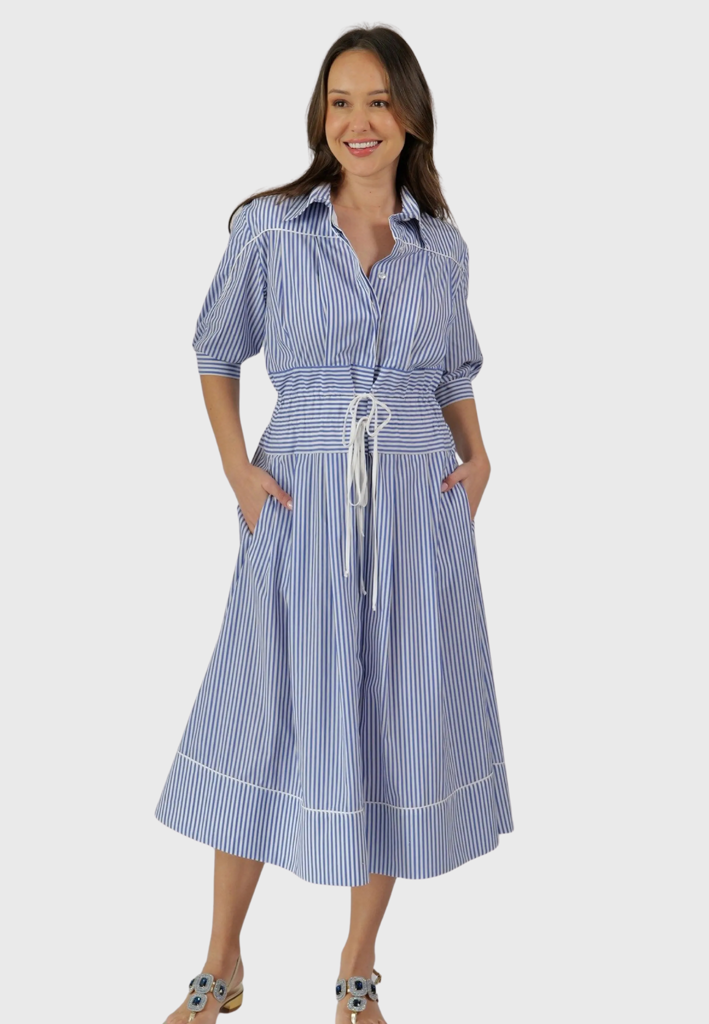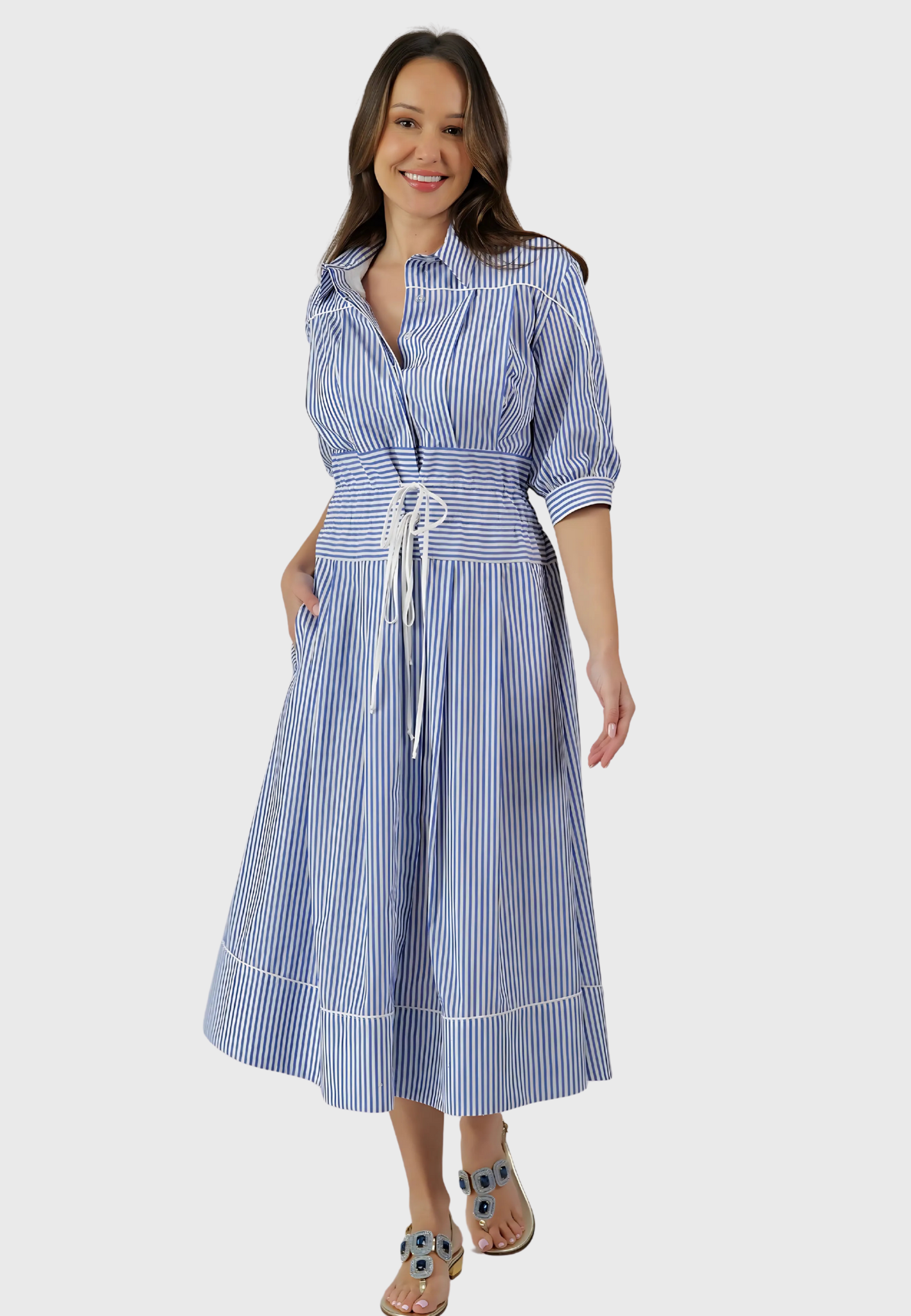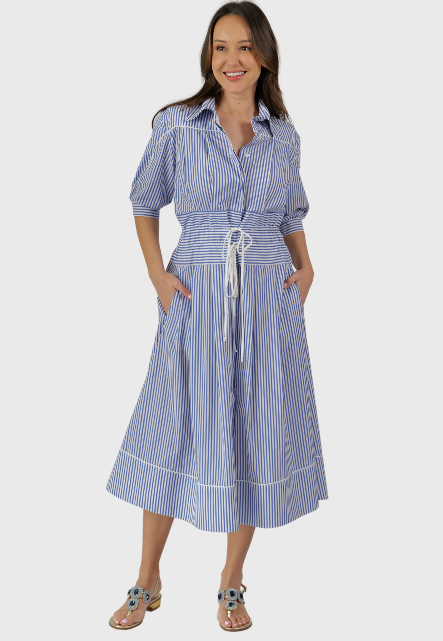 The Positano Dress is crafted in crisp Italian cotton with fine vertical stripes that elongate and flatter the figure. With its softly structured collar, tailored elbow-length sleeves, and adjustable double drawstring waist, it blends sharpness and ease in equal measure. The skirt falls gracefully to midi length, while discreet pockets add thoughtful functionality.