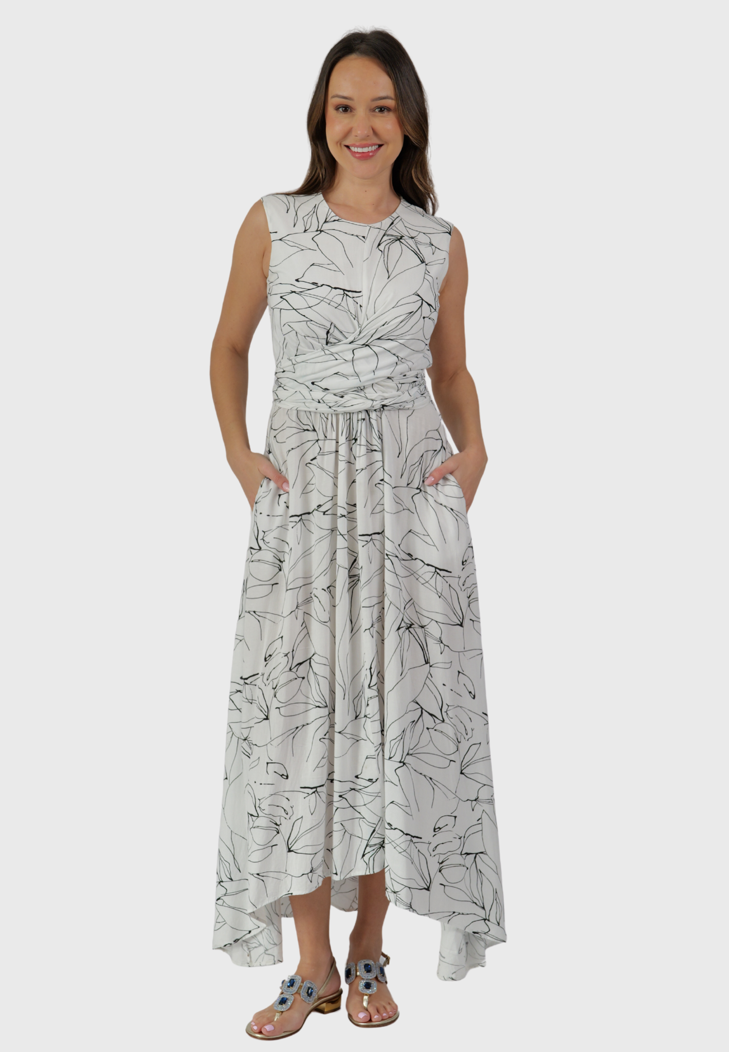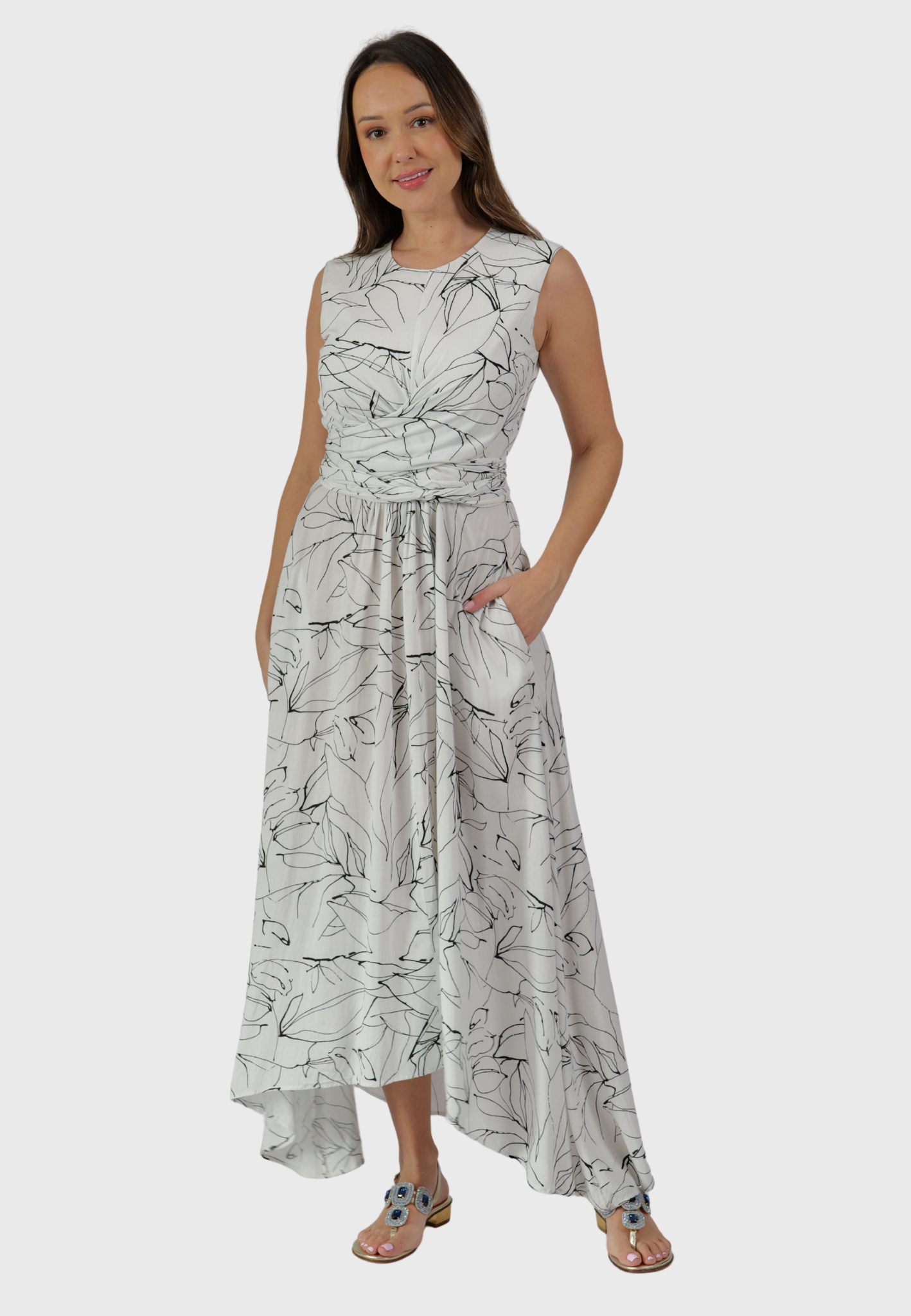 The Venezia Dress is a celebration of Italian craftsmanship and silhouette. Handcrafted in Italy from breathable cotton, it features a fitted bodice, a waist-accentuating self-wrap tie, and a full, voluminous skirt that moves with quiet drama. The fluttered hem adds a graceful finish, while the striking black and white print offers just the right amount of contrast — bold, but never loud.